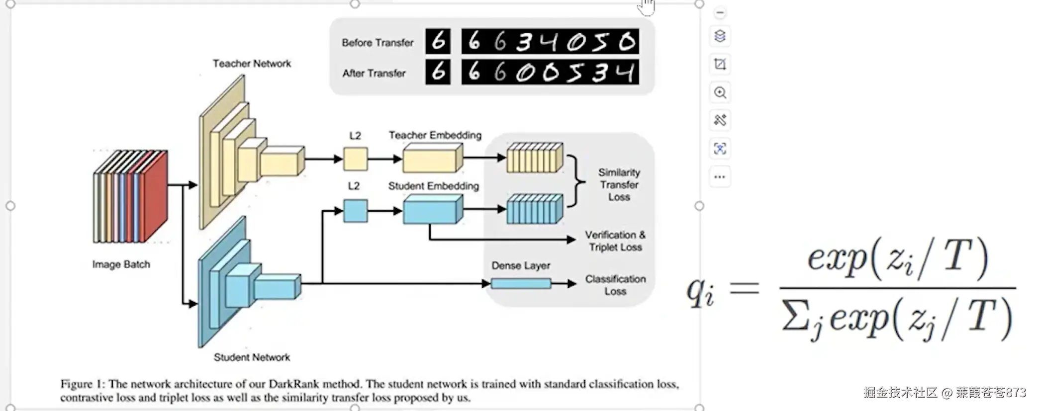 因为本质上来讲这学生模型与教师模型都是神经网络,所以说这个特征对于学生模型的参考意义会非常的大,它会带来一个很神奇的效果,你会发现我们用两个损失同时去训练这个学生模型,他训练的会非常快(就像你在考试,旁边给你安排了个清华教授,你刚做出了一道题,教授直接把答案告诉你,你再参考答案去考试,那肯定快咯)。