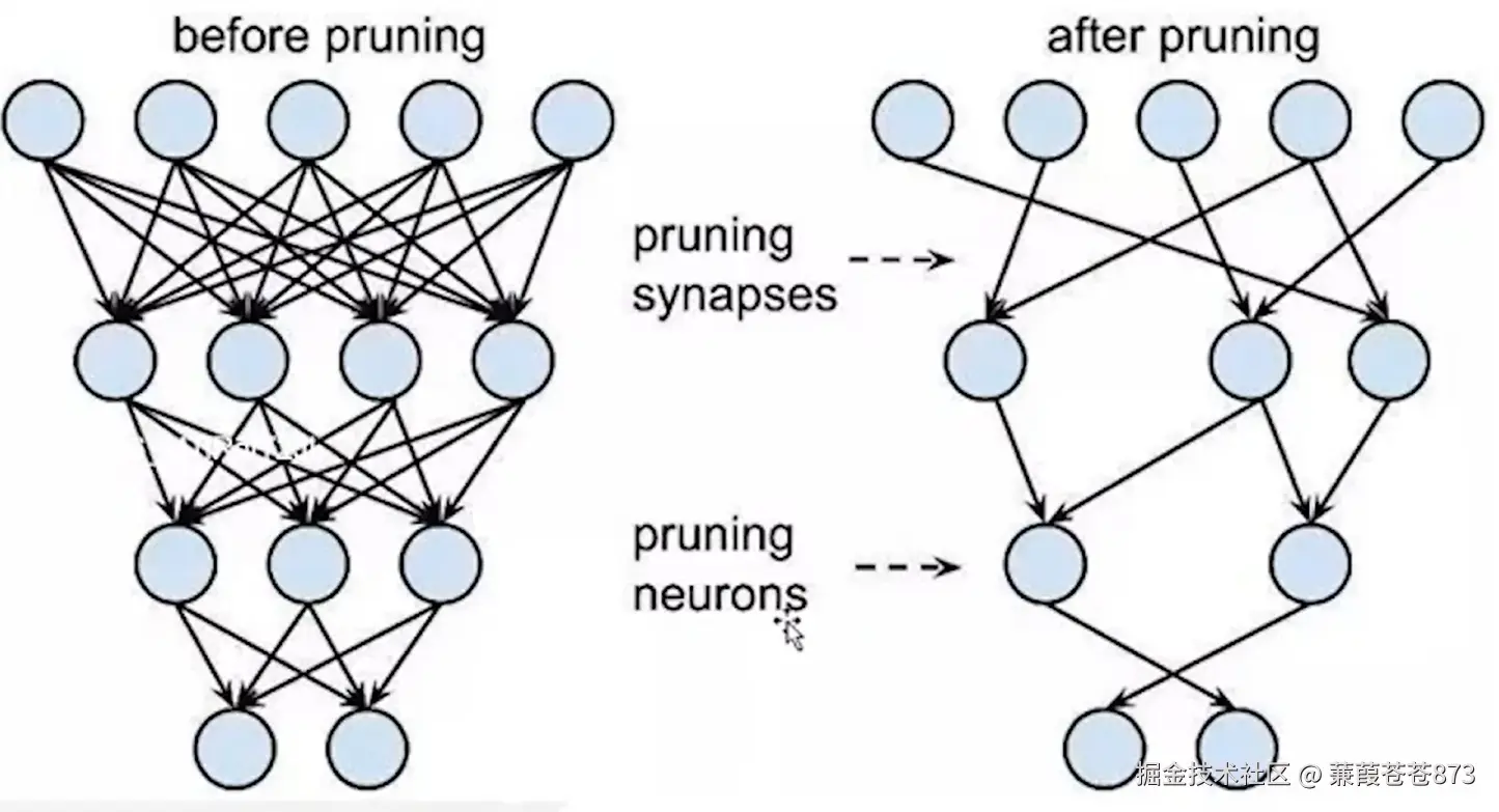 上图是突触剪枝(非结构化剪枝):左侧的网络表示剪枝前的状态,右侧的网络展示了突触剪枝后的状态,其中一些连接被移除,网络变得更加稀疏。这种剪枝方式没有改变模型的结构,剪之前是4层,剪之后还是4层,他把某些层的一些参数给剪掉了,也就是参数变少了,模型的计算复杂度降低了,模型的存储量也降低了,模型跑的也更快了 , 这种方式剪枝之后他的精度损失较少一些,但是它依赖于特定的算法库或者硬件平台的支持,这种方式得看硬件支不支持这种操作,如果硬件不支持这种非结构化剪枝,剪完之后它的计算量非但没有变,而且精度也降低了 。这种方式没有什么实用性,因为对于我们而言,AI模型是个黑盒子,并不知道哪些参数对于你的任务来说是核心参数,有可能这种方式剪枝剪掉的就是最核心的参数。