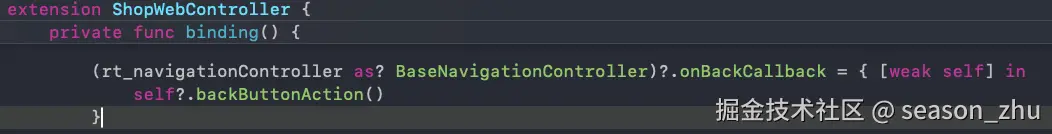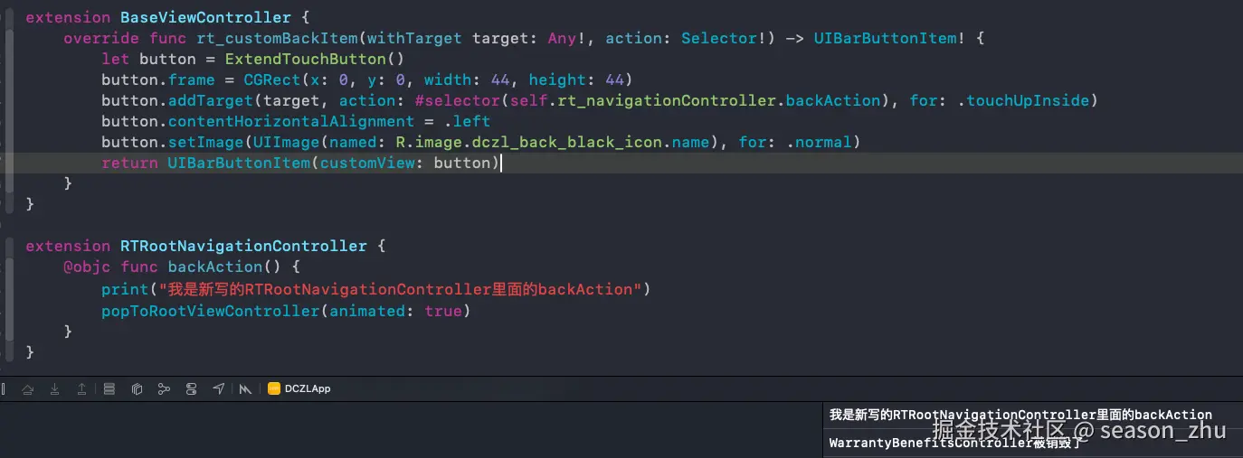我们的重点是onBack方法的重写,OC中RTRootNavigationController的源码,onBack其实在.m文件中,没有声明在.h中,这里添加分类的同时,其实相当于将RTRootNavigationController的onBack方法暴露出来了,如果在OC中写,其实就是为RTRootNavigationController创建分类,并在分类的.h将此方法。