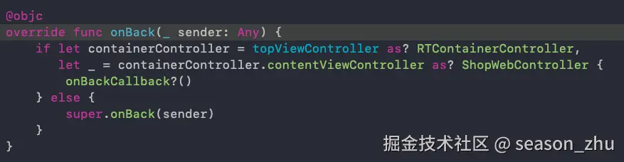 注意的是onBackCallback是全局存在与RTRootNavigationController中的,不同的业务页面可能会对onBackCallback做不同的实现,可能导致的问题就是onBackCallback不断被复写而达不到预期效果,可以考虑onBackCallback实现完成后置为nil,后续有使用再实现。
