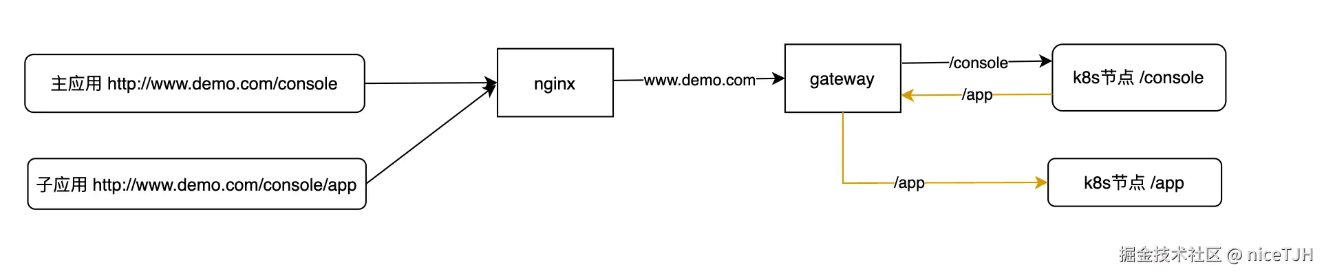 - 前端页面(子应用):www.demo.com/console/app