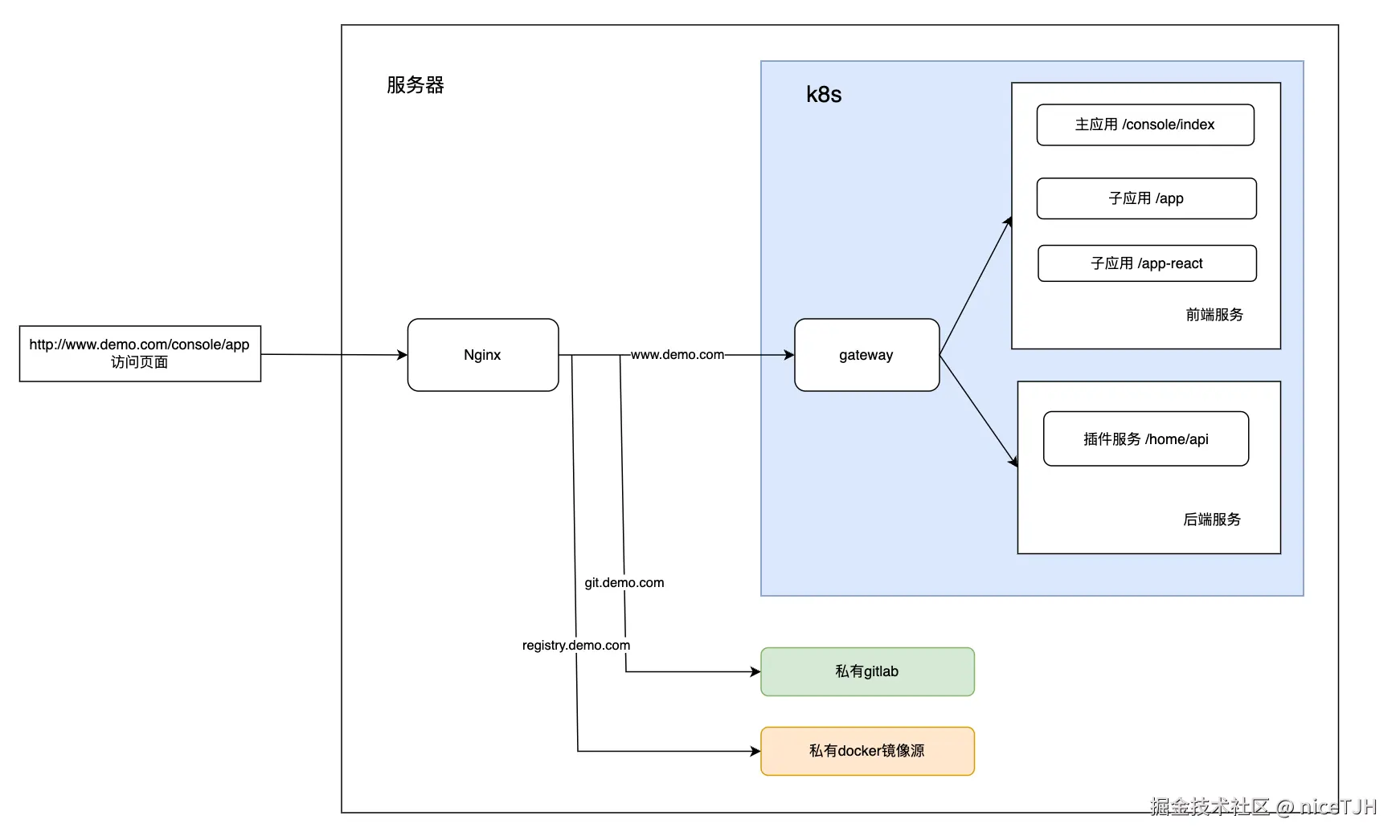 - nginx转发。nginx根据域名来转发到私有gitlab、私有docker镜像源和k8s集群(用来部署应用容器)。