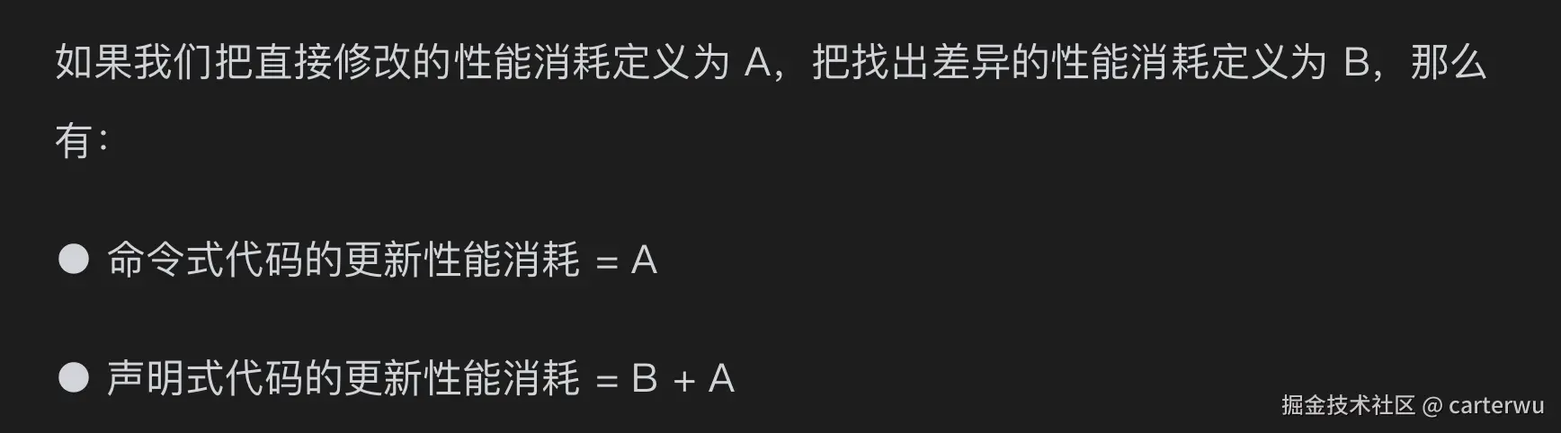 由于声明式代码中,只需要找出需要更新的vdom,进行dom的更新。找出差异的时间消耗B,如果比A数量级小,那么基本就可以认为A =~ A + B
