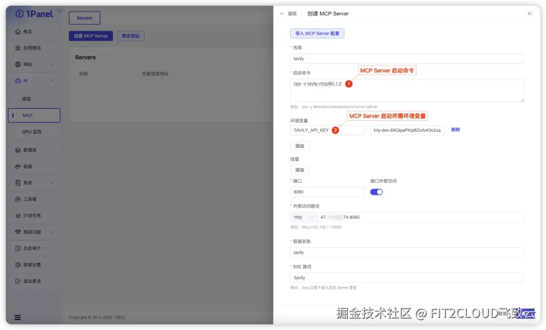 在1Panel左侧菜单栏中依次选择“AI”→“MCP”,点击“创建MCP Server”按钮并填写启动命令、端口号和所需环境变量等基础配置信息,即可在1Panel管理的服务器上一键部署MCP Server实例,无需在本地拉取代码或手动安装依赖。