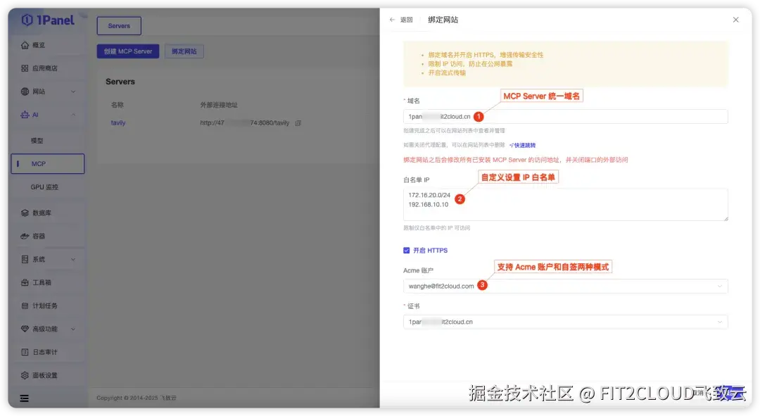 通过为MCP Server网站配置IP访问白名单,可以有效隔离外部非授权访问,在网络入口层面建立起第一道安全防线。同时配合1Panel的防火墙策略和容器隔离机制,可以显著提升整体系统的安全性与稳定性。