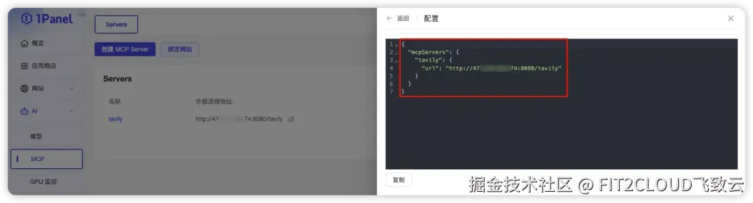 MCP Server部署成功后,1Panel会为每个MCP Server实例自动生成客户端配置信息,包括端口、地址、SSE路径等。点击“配置”按钮,即可快速获取该MCP Server的客户端配置信息。