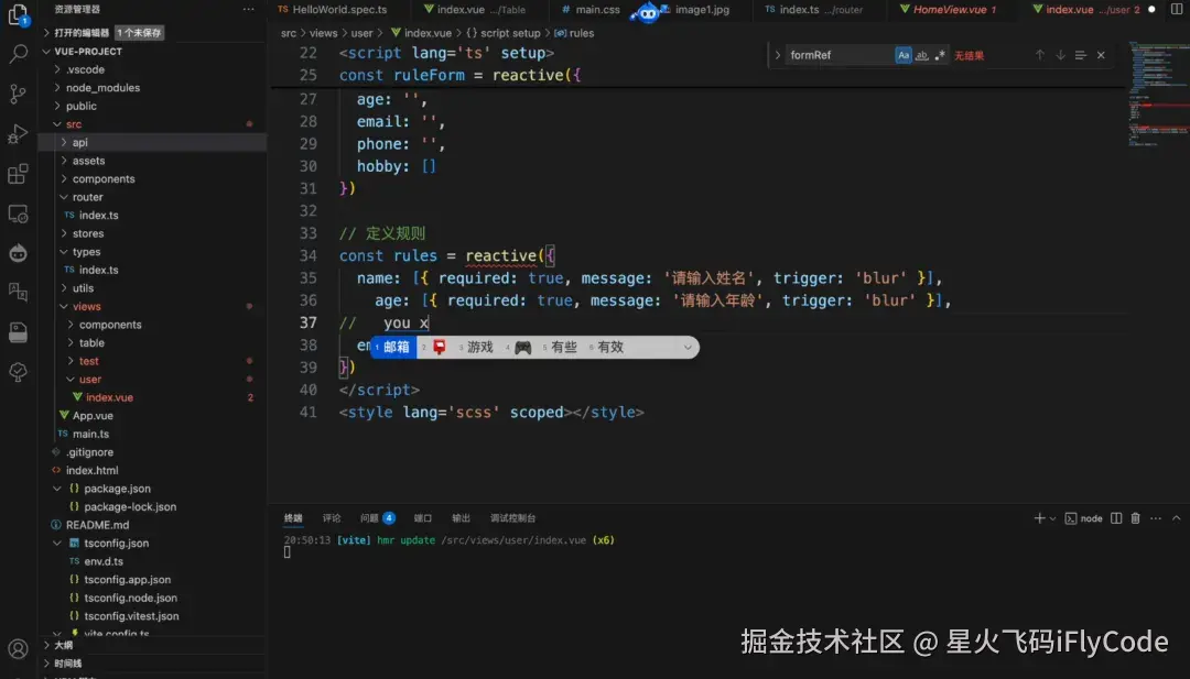 现在我们还缺少一个Rules,我们可以在下面继续让它定义规则然后回车,它就会帮我将一些表单的校验规则定义出来。