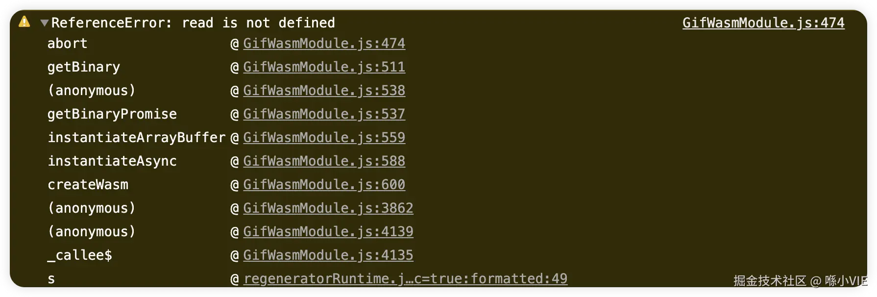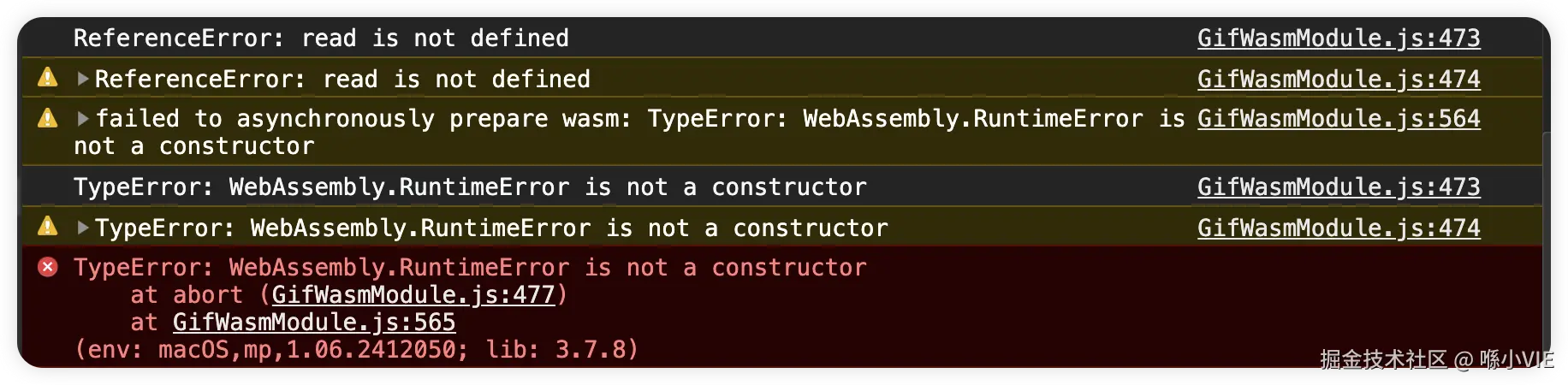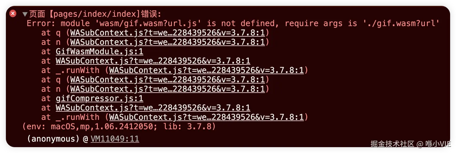 WebAssembly.RuntimeError is not a constructor,看字面意思是小程序的WXWebAssembly的RuntimeError没有提供构造函数。这里不用管因为有实际抛出异常的代码才会走到这里。