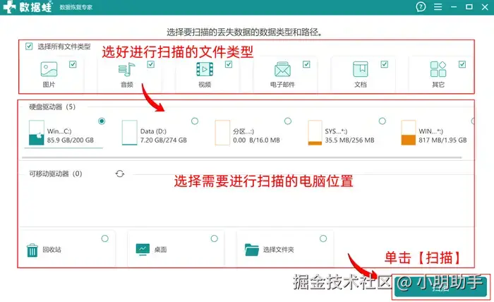 步骤1:打开数据 蛙恢复专家,在页面上方选择文件类型,然后在中下方选择扫描位置,点击【扫描】;