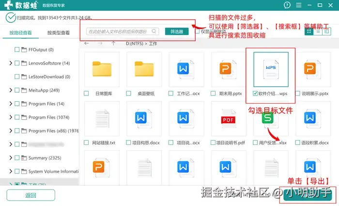 步骤2:扫描结束后,在指定的位置上选择需要恢复的文件,点击【导出】;