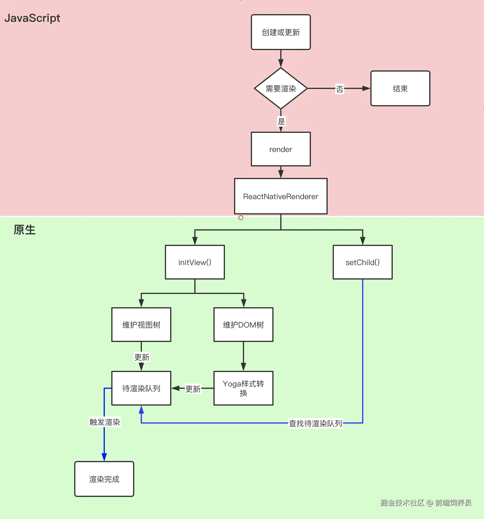 首先需要完成渲染。React Native 的渲染流程分为上下两部分,上半部分表示的是 JavaScript 端处理的逻辑,下半部分代表的是原生端处理的逻辑。