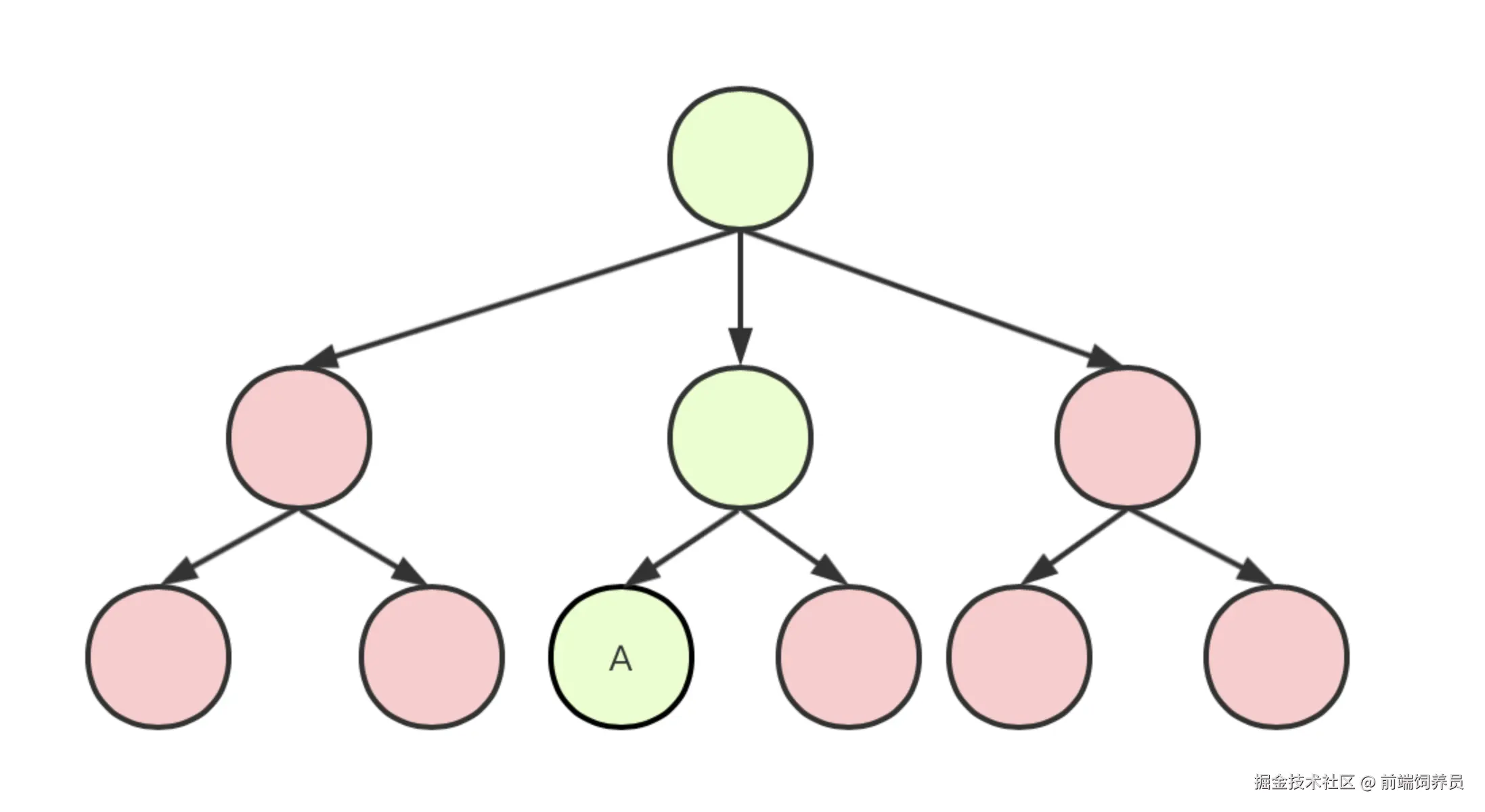 假设这是我们的视图树,如果根视图通过修改自身持有的 state 方式去驱动最末端的绿色节点 A,去进行渲染。在默认情况下,React 会重新渲染整个视图树,包括其他的红色节点,但是这样一定会造成一定的冗余开销。其实,只需要渲染 A 节点和它的关联父节点,就能达到更新视图的目的。