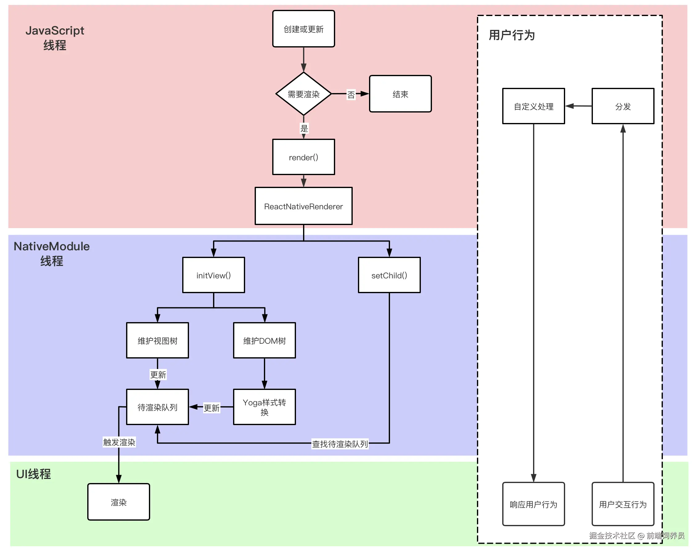 首先用户的行为是在原生端的 UI 线程触发的,然后通过 NativeModule 线程将行为数据传递给 JavaScript 线程,再由其自行分发到对应的视图组件中来响应具体的绑定函数,处理完成之后,NativeModule 线程再去通知 UI 线程,对用户的这次行为做出反馈。