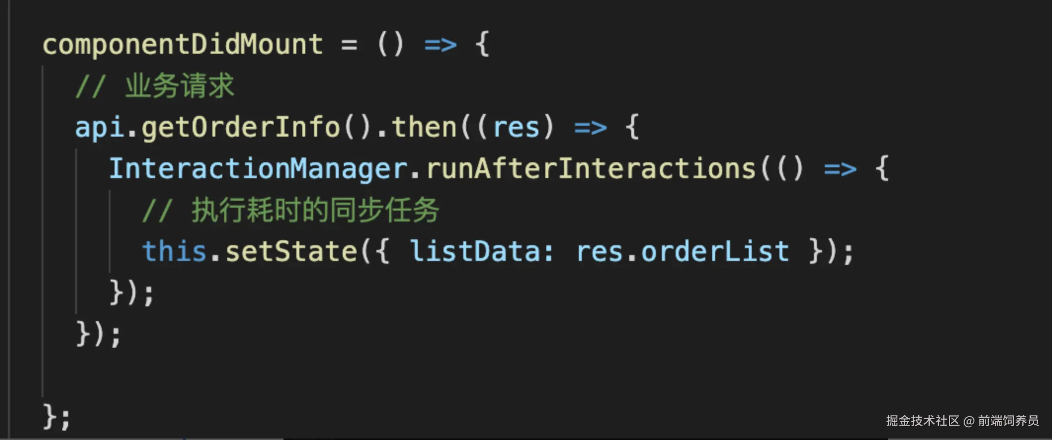 使用 InteractionManager 我们就可以在网络请求完成之后,通过 InteractionManager 中的 runAfterInteractions 函数来监听用户行为是否响应完成,也就确保了在用户行为响应完成之后才开始调用 setState,使视图能在相对空闲的时间里进行渲染,从而降低用户滑动列表时的掉帧风险。