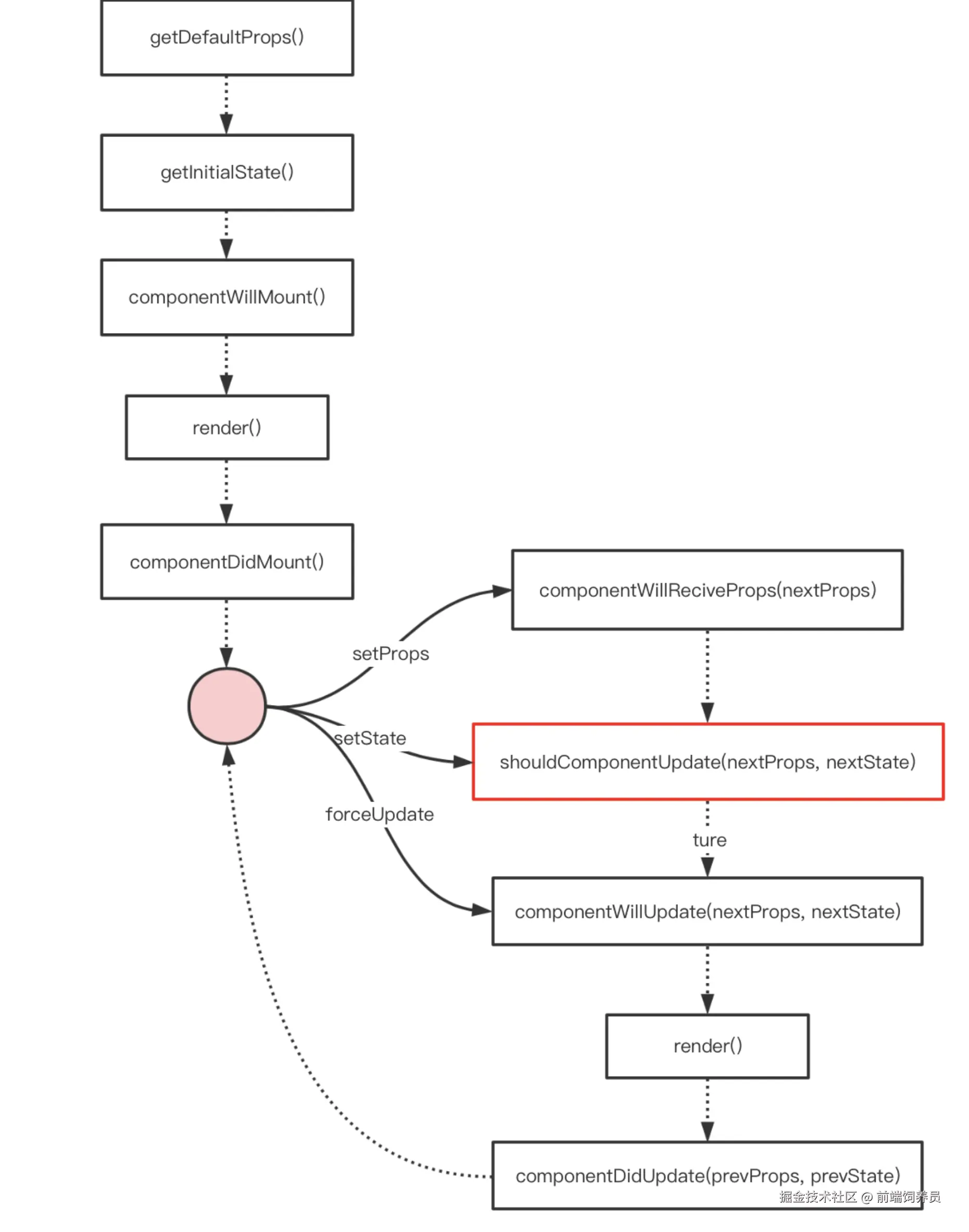 一个 React 组件在第一次渲染的时候,会携带初始的 state 和 props 进入 render 的渲染流程;但是当第一次渲染完成后,所有通过 setProps 和 setState 触发的更新请求都会全部交给 shouldComponentUpdate 这个函数来做对比,只有当返回值为 true 的时候才会引起视图的更新。也就是说,我们可以在这个节点对渲染流程进行干预,来避免过度渲染。