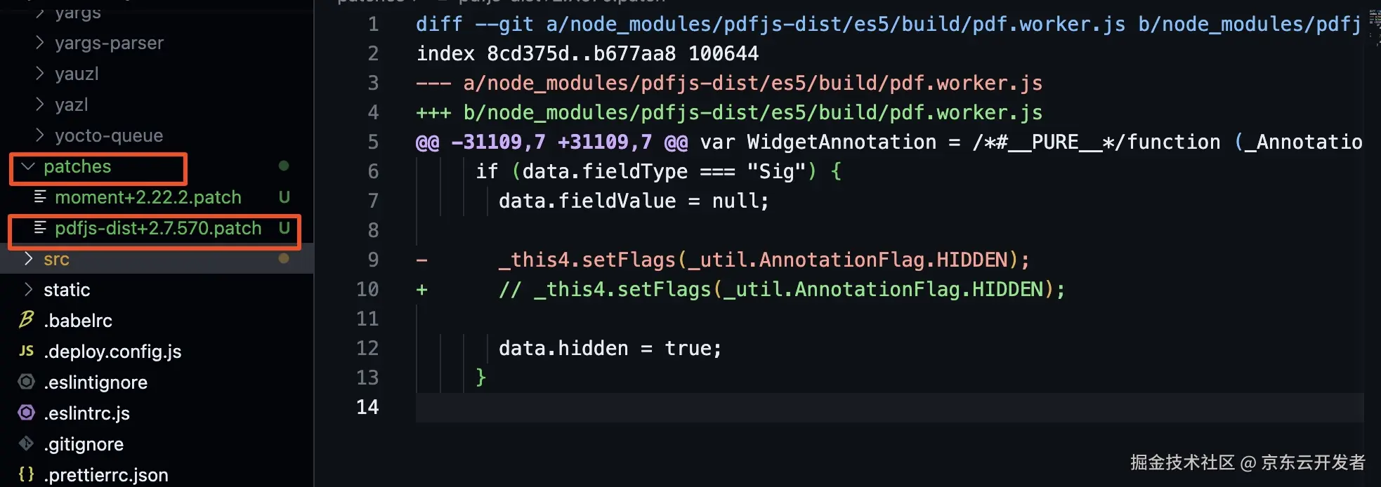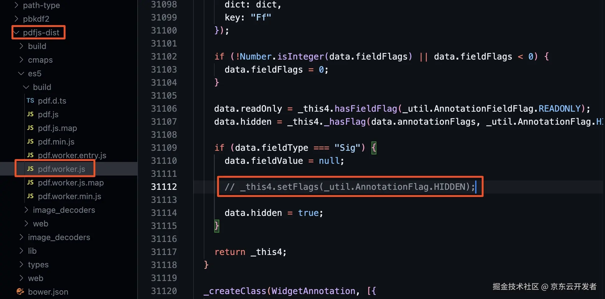在本文示例中,在node_modules找到要修改的依赖包pdfjs-dist,修改代码如下: