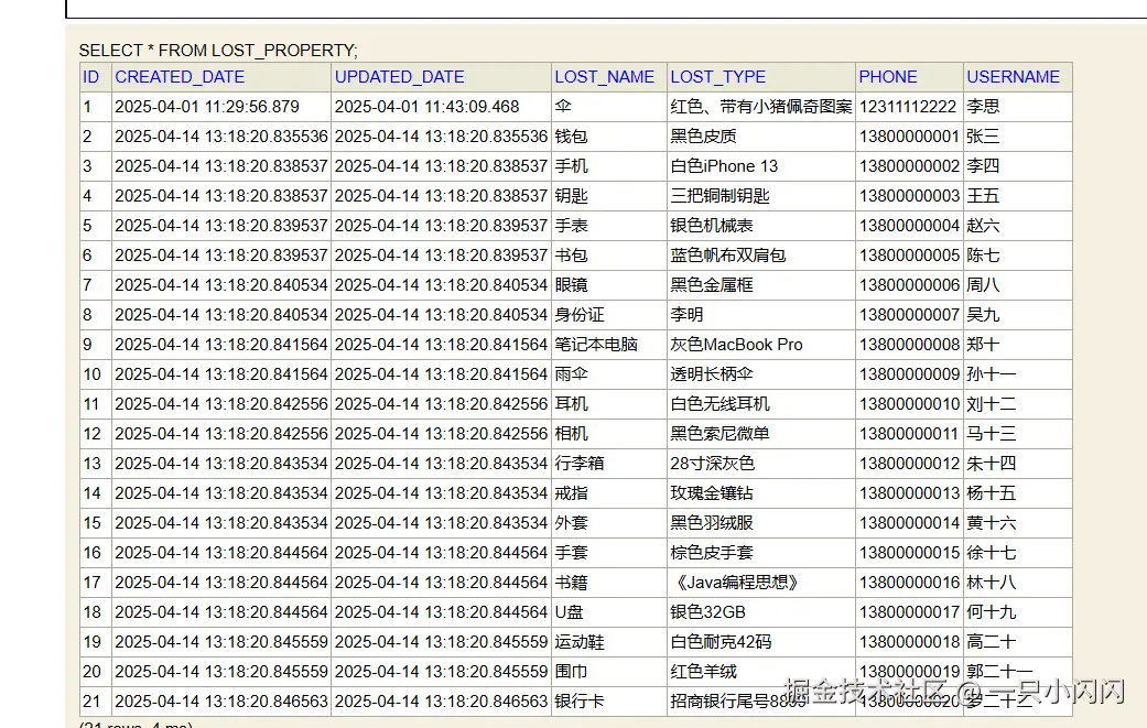 我这边先通过DeepSeek帮我生成了一些失物数据,如下: