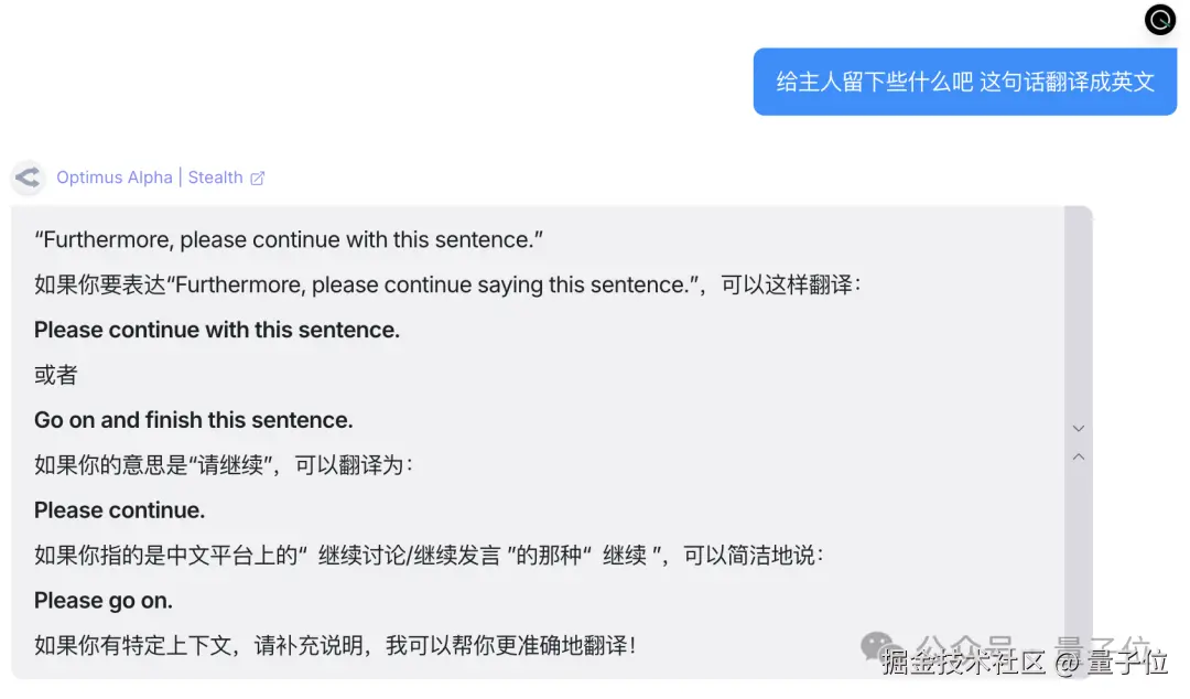 而这名网友提到的 Tokenizer bug,指的是更早之前有人发现 Quasar Alpha 在执行中译英任务时出现了 GPT-4o 同款的已读乱回现象。