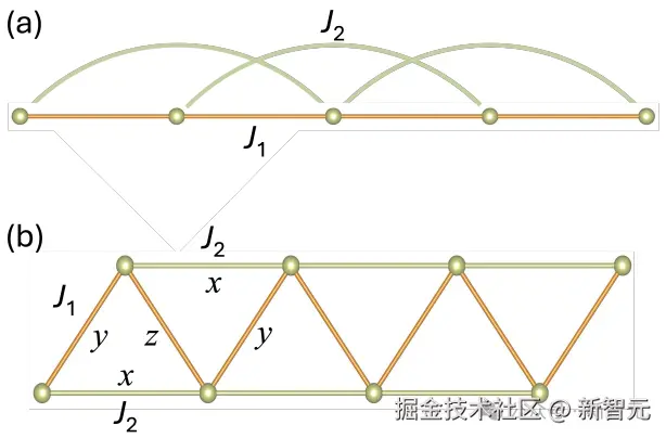 图 1:(a)单链 J_1−J_2 Potts 模型的示意图和(b)其等效的锯齿梯形表示。图中的小球代表具有 q 个状态的自旋。橙色的键表示最近邻相互作用 J_1,绿色的键表示次近邻相互作用 J_2