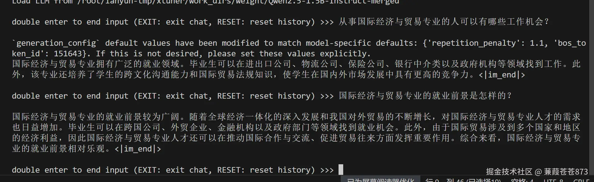 xtuner chat /root/lanyun-tmp/xtuner/work_dirs/weight/Qwen2.5-1.5B-Instruct-merged --prompt-template qwen_chat