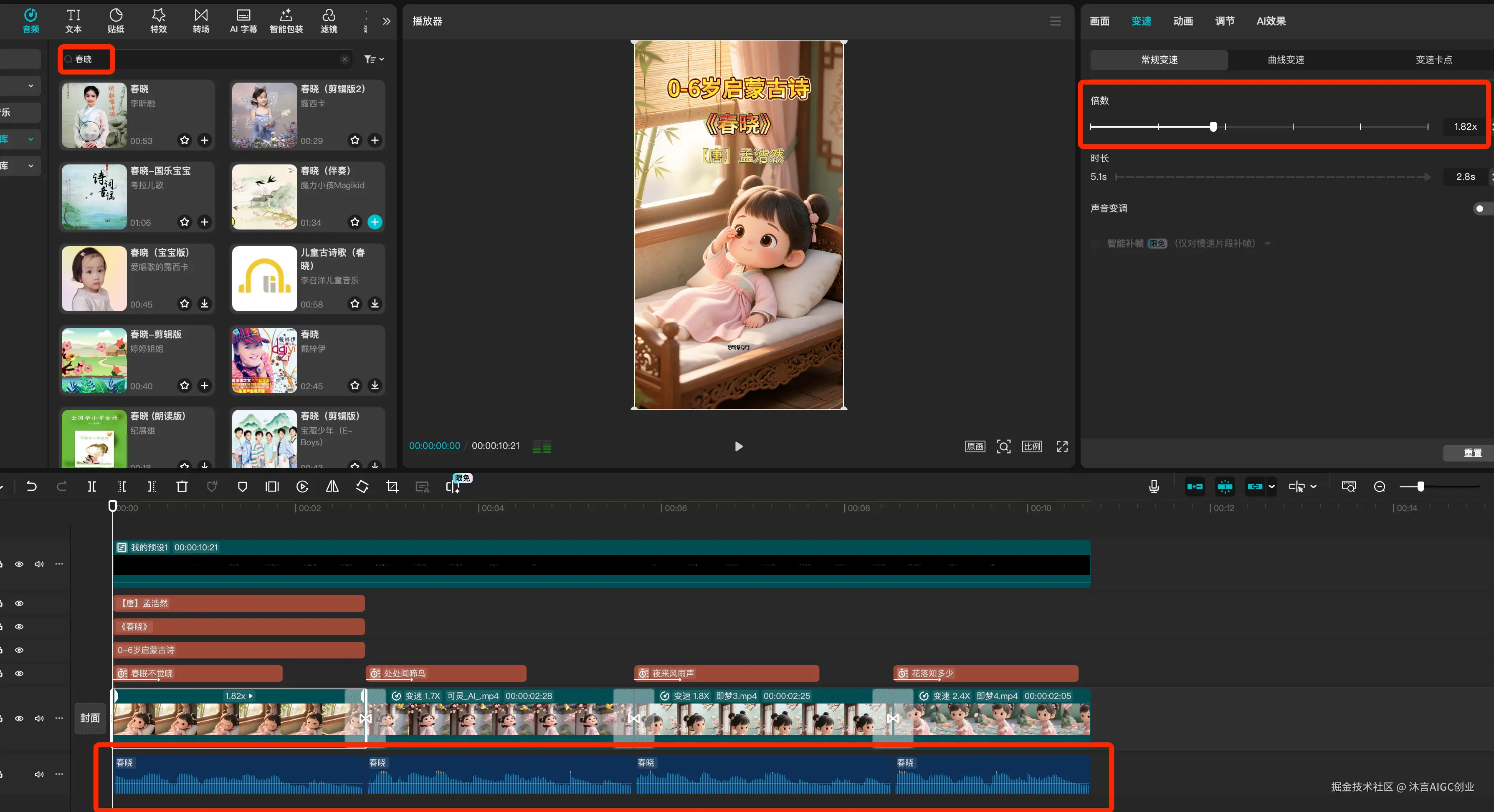 然后将声音中 4 句诗歌剪辑出来,再对每个视频进行变速,保持音画同步