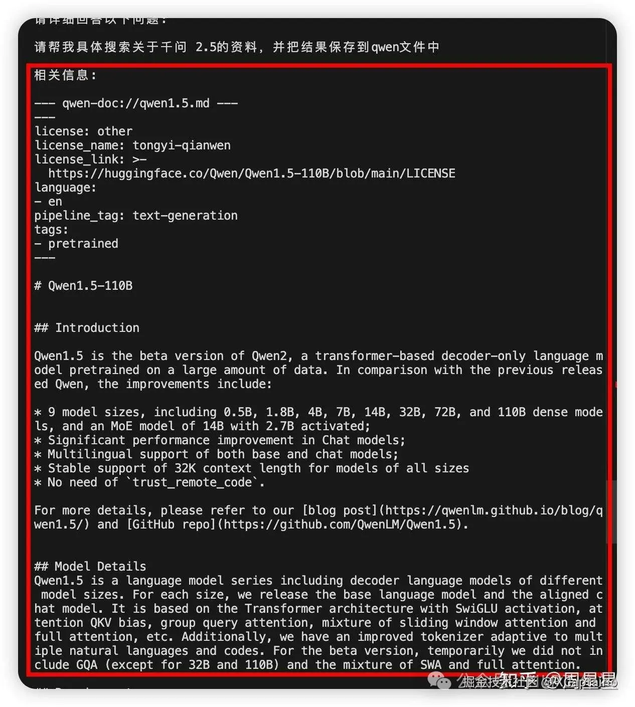 启动成后,我们询问“请帮我具体搜索关于千问 2.5的资料,并把结果保存到qwen文件中”