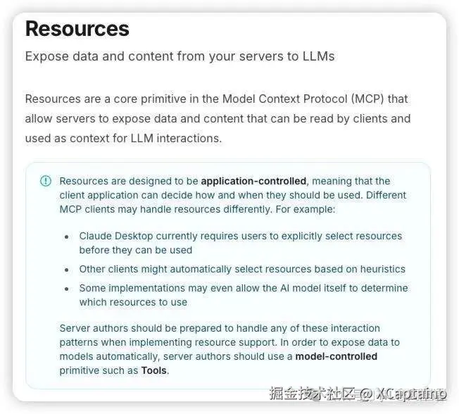 某些实现甚至允许AI模型自行决定使用哪些资源。如用户的 prompt 过来,我们可以另外写一个 prompt,问模型说现在的这么多 resource有哪些用户的问题相关,如相关的,可以把对应的 resource 作为接下来的上下文。