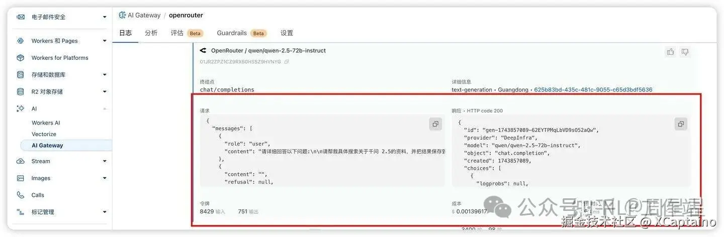 我们可以用Cloudflare来监控和记录整个过程。Cloudflare是一个调用大模型的路由服务,它能限制流量、记录日志,让我们更容易调试。通过Cloudflare的日志功能,我们能清楚看到整个调用过程中的所有输入到模型中的prompt和模型的output: