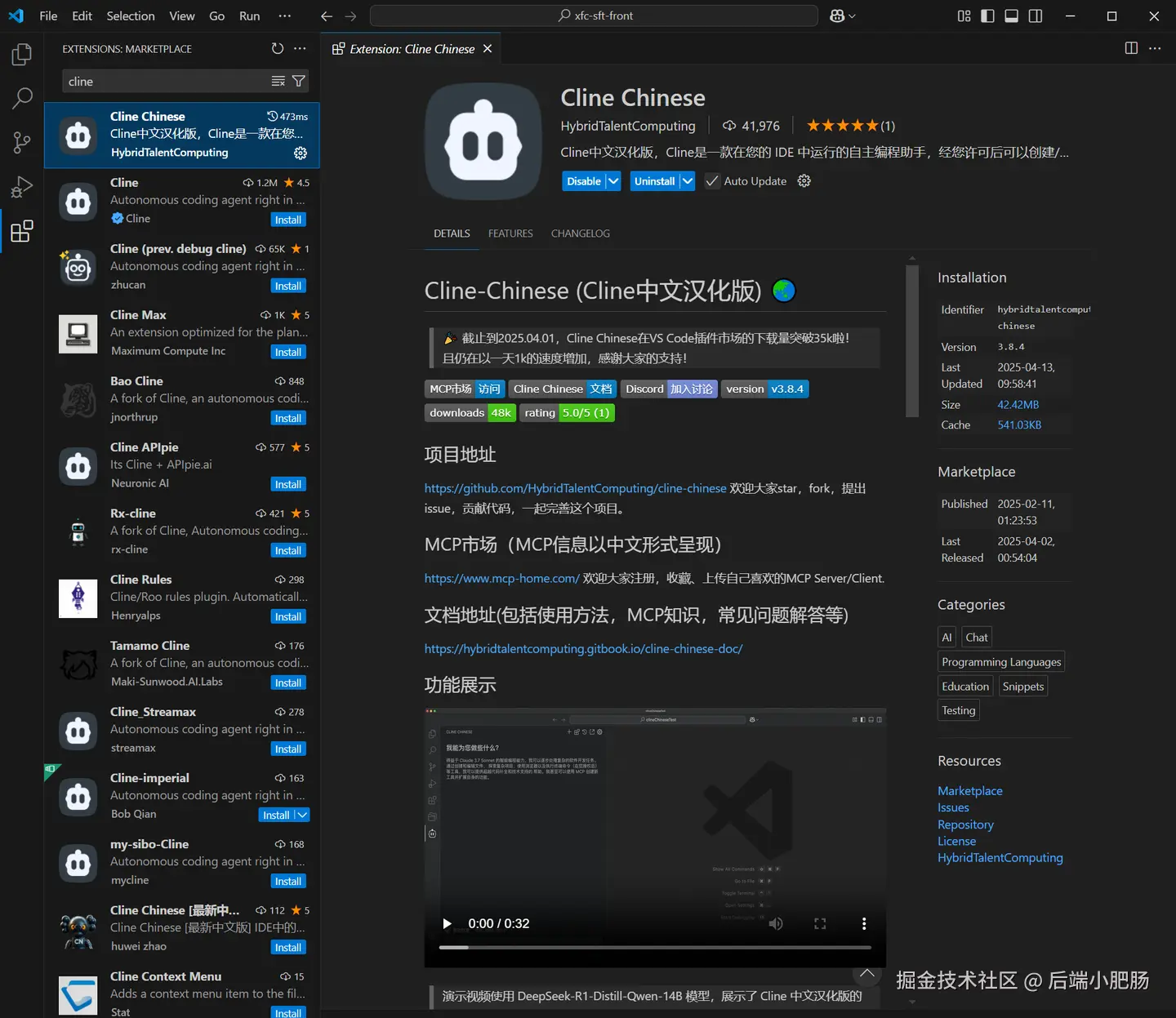 首先在VS Code中安装Cline插件,我安装的是中文汉化版: