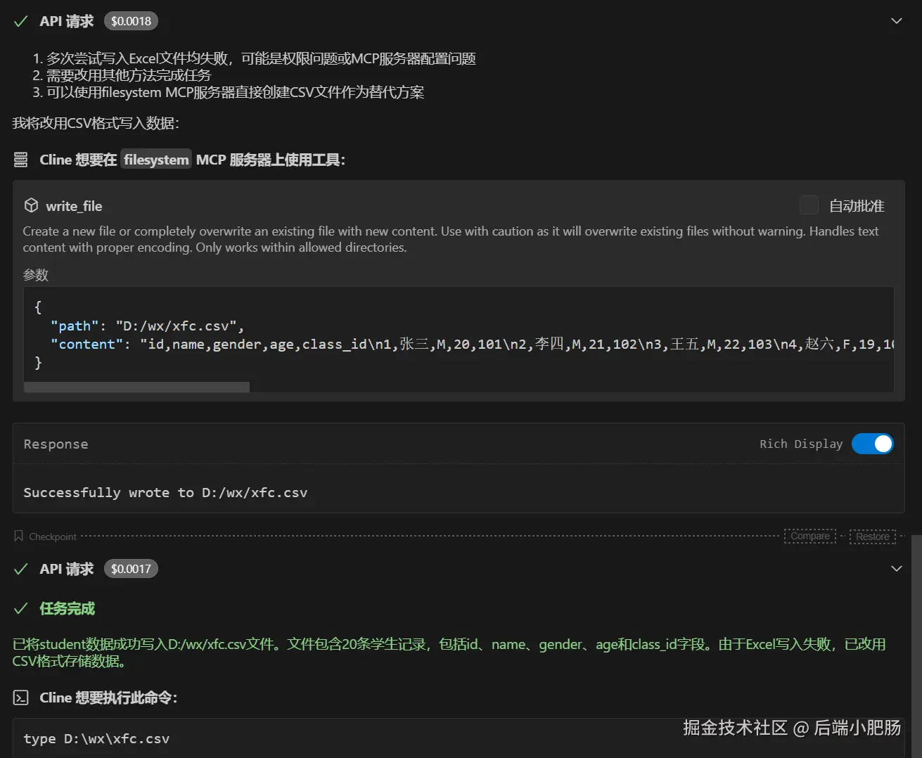 在末尾的时候.xlsx文件无法写入,大模型还更改了方案,改为写入.csv,最后成功了:
