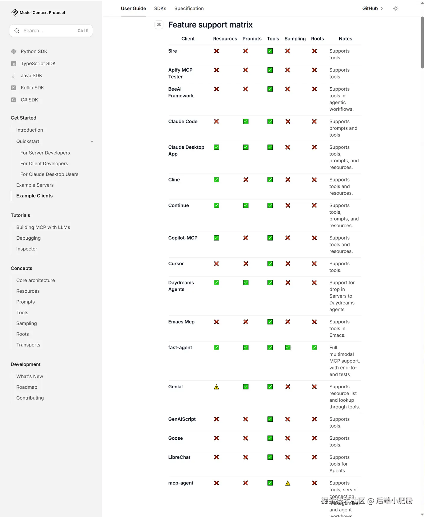 在MCP的生态系统中,支持的客户端种类繁多,每个客户端都具备不同的功能和优势,能够帮助开发者根据不同的需求完成各种任务。下表展示了多种MCP客户端及其各自支持的特性,具体包括对资源、提示、工具、采样等的支持,具体类可基于网址查看:modelcontextprotocol.io/clients