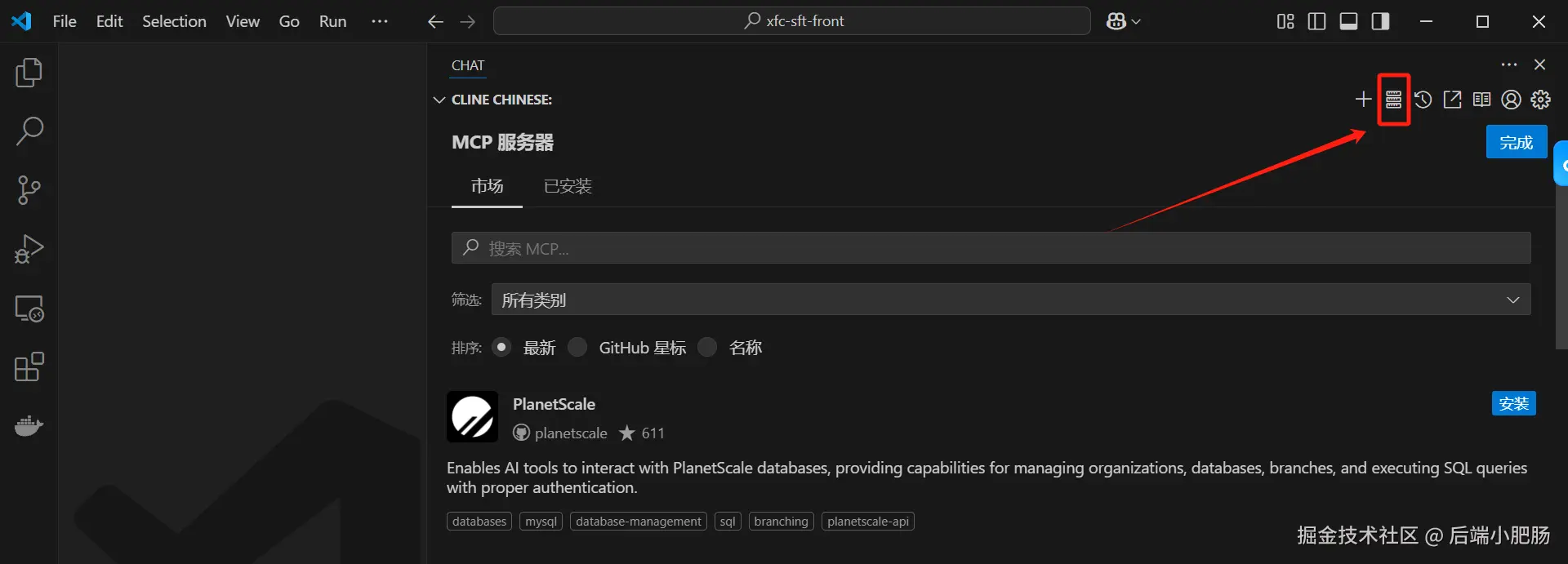 在上面命令中吧username、pwd、database_name这三个参数换成你自己的数据库配置,配置完了以后可以看一下右侧的已安装选项页是否安装了对应的MCP Server。