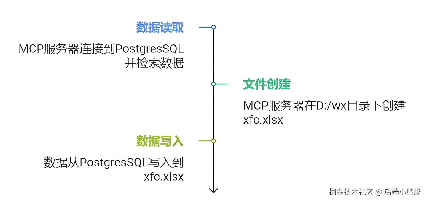 - 数据写入 最后,FileSyetem(MCP Server)将把从PostgresSQL数据库中读取的数据写入到刚刚创建的xfc.xlsx文件中。此过程需要处理数据格式的转换和写入操作的执行,确保数据能够以正确的格式存储在Excel文件中。