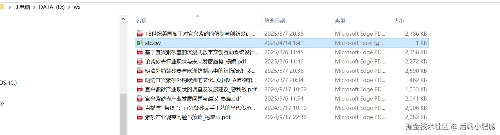 我现在去目录下面看一下结果,发现D:/wx目录下面新建了xfc.csv: