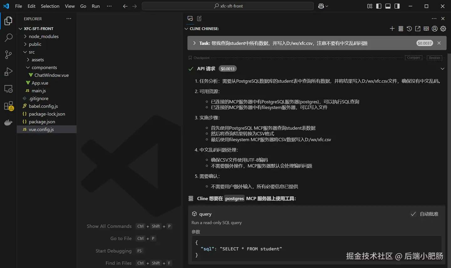 本文通过两个开源MCP Server(FileSystem/PostgreSQL),在VS Code中搭建起从数据库查询到文件输出的完整工作流。当看到AI自主分解任务、调用工具并最终生成CSV文件的那一刻,我仿佛触摸到了未来:或许"人人手搓 智能体"的时代,真的不再遥远......