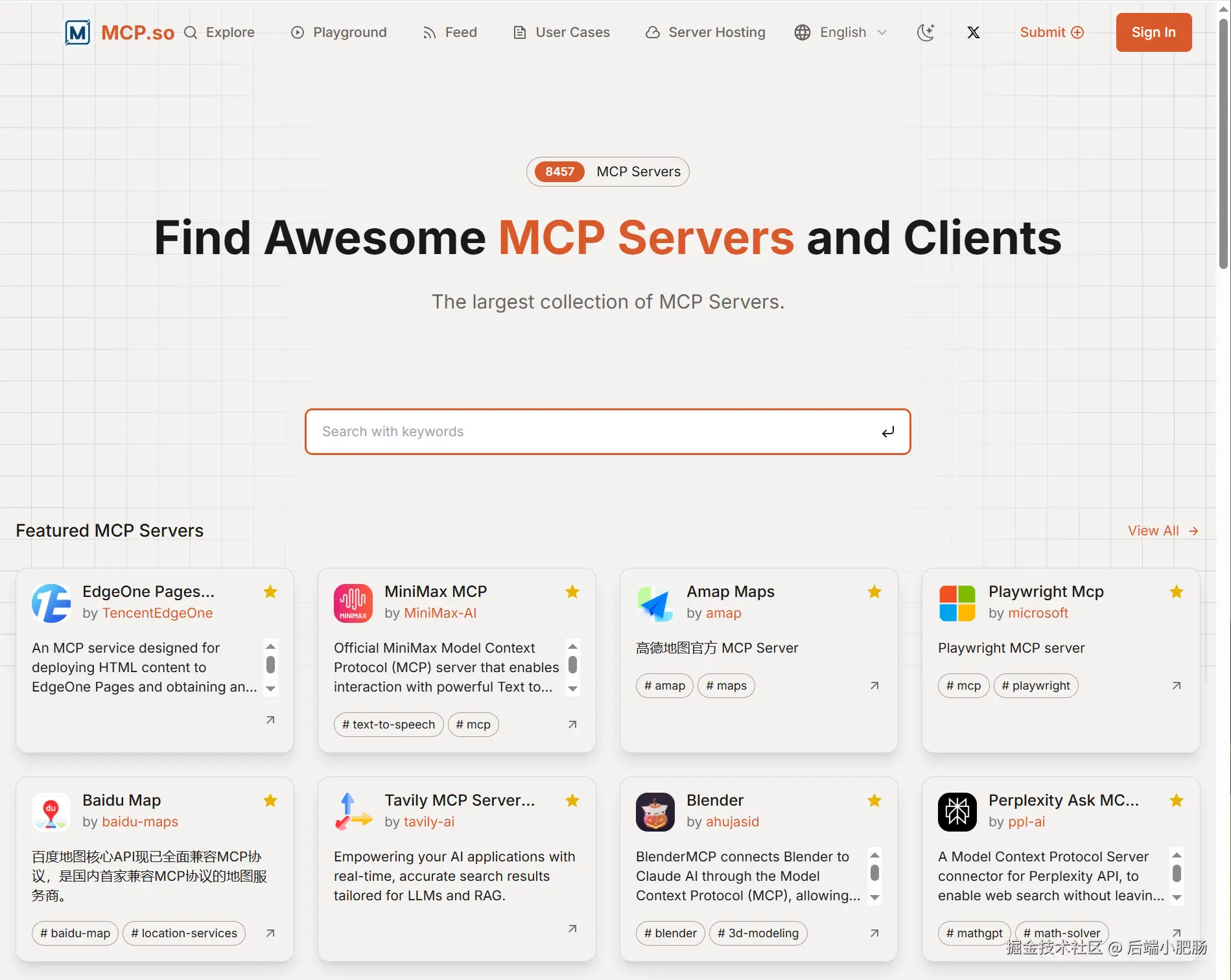 - MCPSo:mcp.so/,这个网站是一个专门收集和展示Model Context Protocol(MCP)服务器的平台,致力于为开发者和用户提供丰富的MCP服务器资源。在MCPSo上,你可以浏览各种类型的MCP服务器,包括地图服务、浏览器自动化、数据处理等,满足不同场景下的需求。此外,MCPSo还提供了服务器的详细信息和配置示例,帮助用户快速上手和集成。