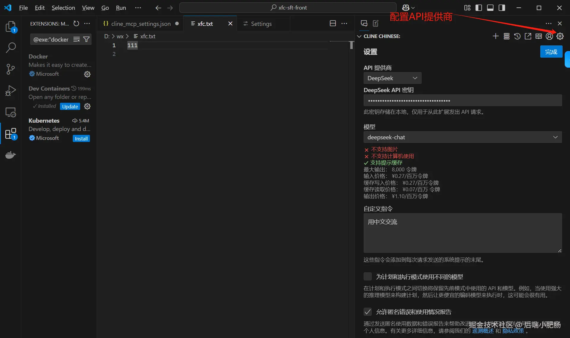 Cline安装完成以后需要配置一下API提供商(我选的DeepSeek)。