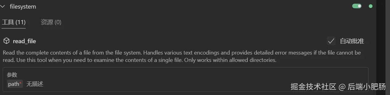 从图上可以看出FileSystem有很多功能,比如读取文件,写入文件,编辑文件等,每个功能都有使用说明,比如read_file,要用这个工具就需要传入path,path的话我们在配置文件里面已经配置过了。