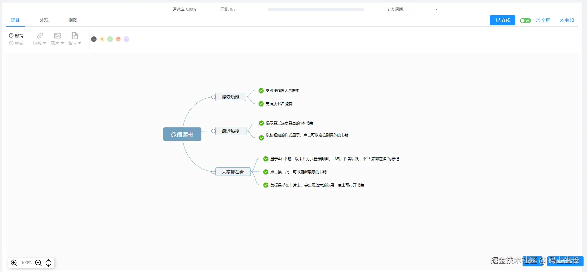 以微信读书PC端的功能为例,图一为微信读书PC端的页面,图二为根据功能编写的测试用例,如下所示: