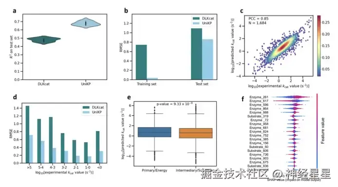 经验证 UniKP 在 kcat 预测显著优于现有模型,首次实现 kcat/Km 预测。 以 kcat 为例,在公开可获得最大数据集上,决定系数相较于目前 SOTA 结果提高了 20 个百分点,同时在不同数据集划分、不同区间划分、 不同酶类别划分等多类任务上,表现也明显突出。