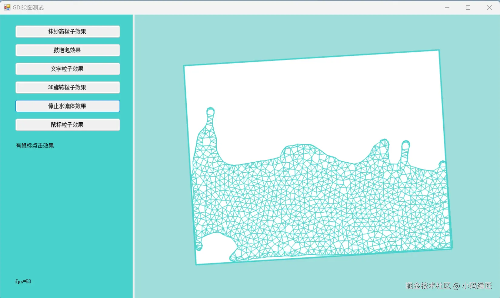 2、在Paint事件中重绘粒子,不要在While(true)之类的循环里无间隔调用。Winform中的Paint事件就相当于JavaScript中的requestAnimationFrame事件。