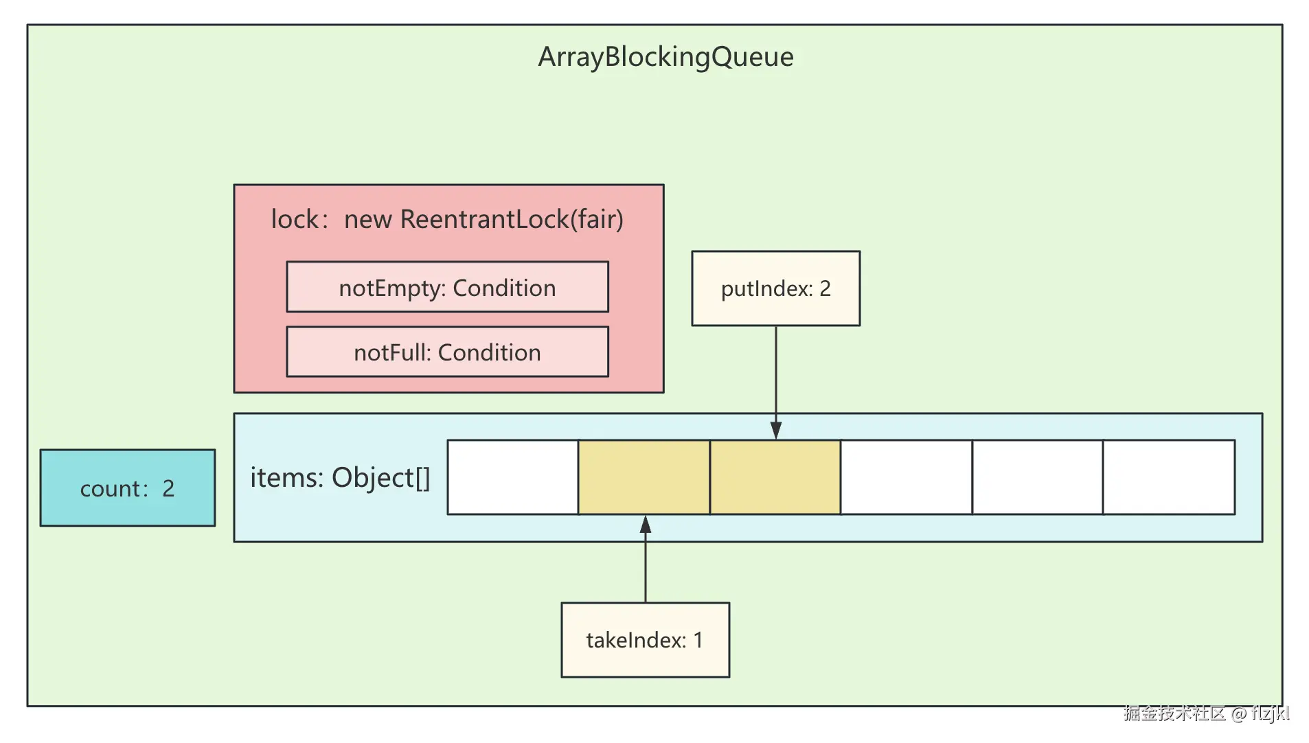 为了方便等下看源码,主播简单的画了下,ArrayBlockingQueue的结构,大概如下图所示: