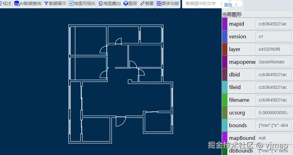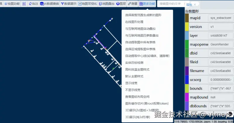 在唯杰地图管理云平台 上传要提取中心线的CAD图形,成功打开后,点击“更多功能”里面的“自动提取中心线(如墙体、道路)”
