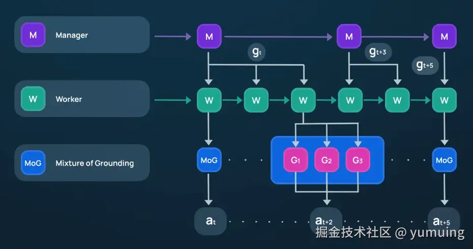 - 协作机制:Worker 模块作为 “门控器”,根据动作类型(点击、输入、拖拽)动态路由至对应专家,避免通用模型 “全能但不精” 的缺陷。