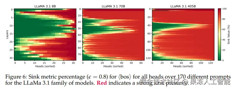 此外,随着模型规模的增长,注意力黑洞也会变得更强。在小模型中,注意力头更活跃、信息混合更频繁;而在大模型中,我们会看到更强的注意力黑洞(为了防止混过头)。