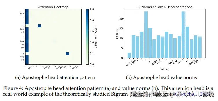 还有一个很有趣的现象是:有的注意力头表现出一种“if-else”风格的行为。比如某个注意力头在前一个 token 含有撇号(')时才会活跃;如果没有撇号,它就几乎不关注这个序列。这时候,注意力黑洞就会吸走大部分注意力,从而避免对 token 表示的不必要修改。
