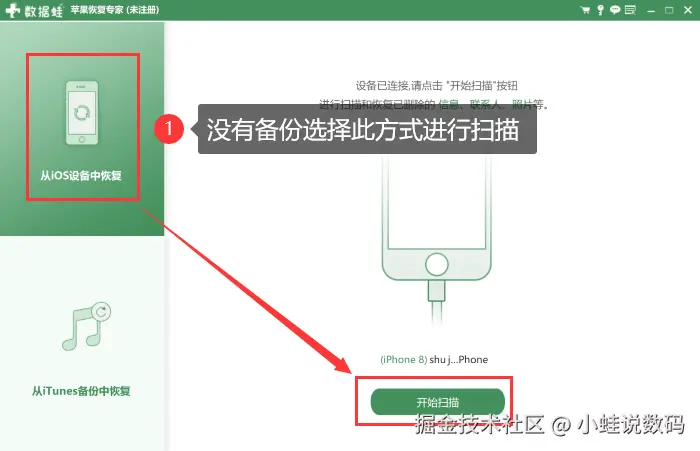 步骤1:将苹果手机连接到电脑上,确保软件能够识别到手机。启动数据蛙苹果恢复专家,选择相应的扫描模式(没有备份选择从iOS设备中恢复选项),然后点击【开始扫描】。