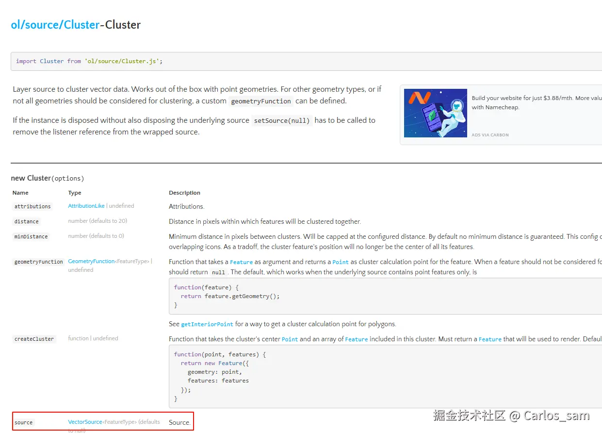 在Openlayers中主要通过Cluster数据源来实现聚合的效果。与其它的数据源不同,Cluster数据源在实例化时需要接收一个矢量数据源作为参数,然后在将Cluster数据源作为一个矢量图层的数据源,这样就能实现对矢量数据源中图形的聚合。