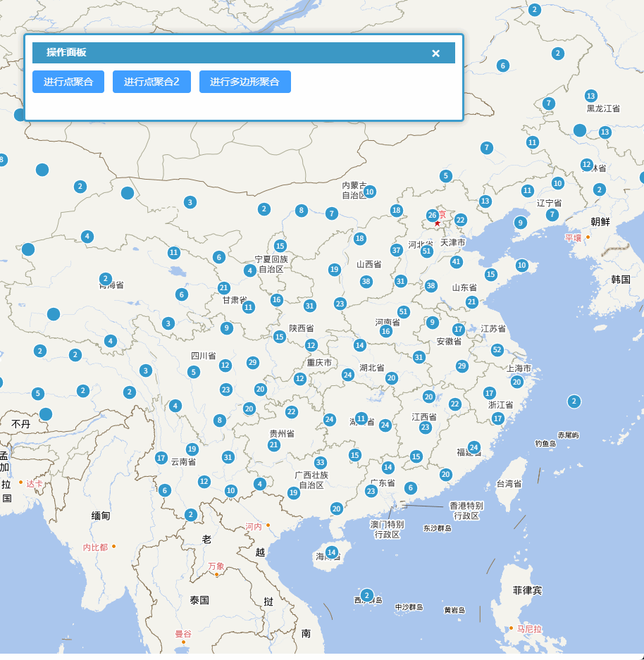 从之前的示例可以看到,聚合后的聚合图形都是点,如果希望使用其它的图形作为聚合图形,那就需要使用createCluster属性进行自定义。