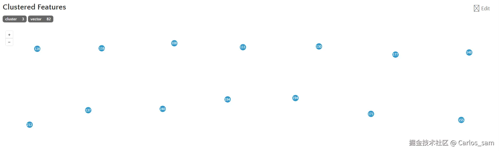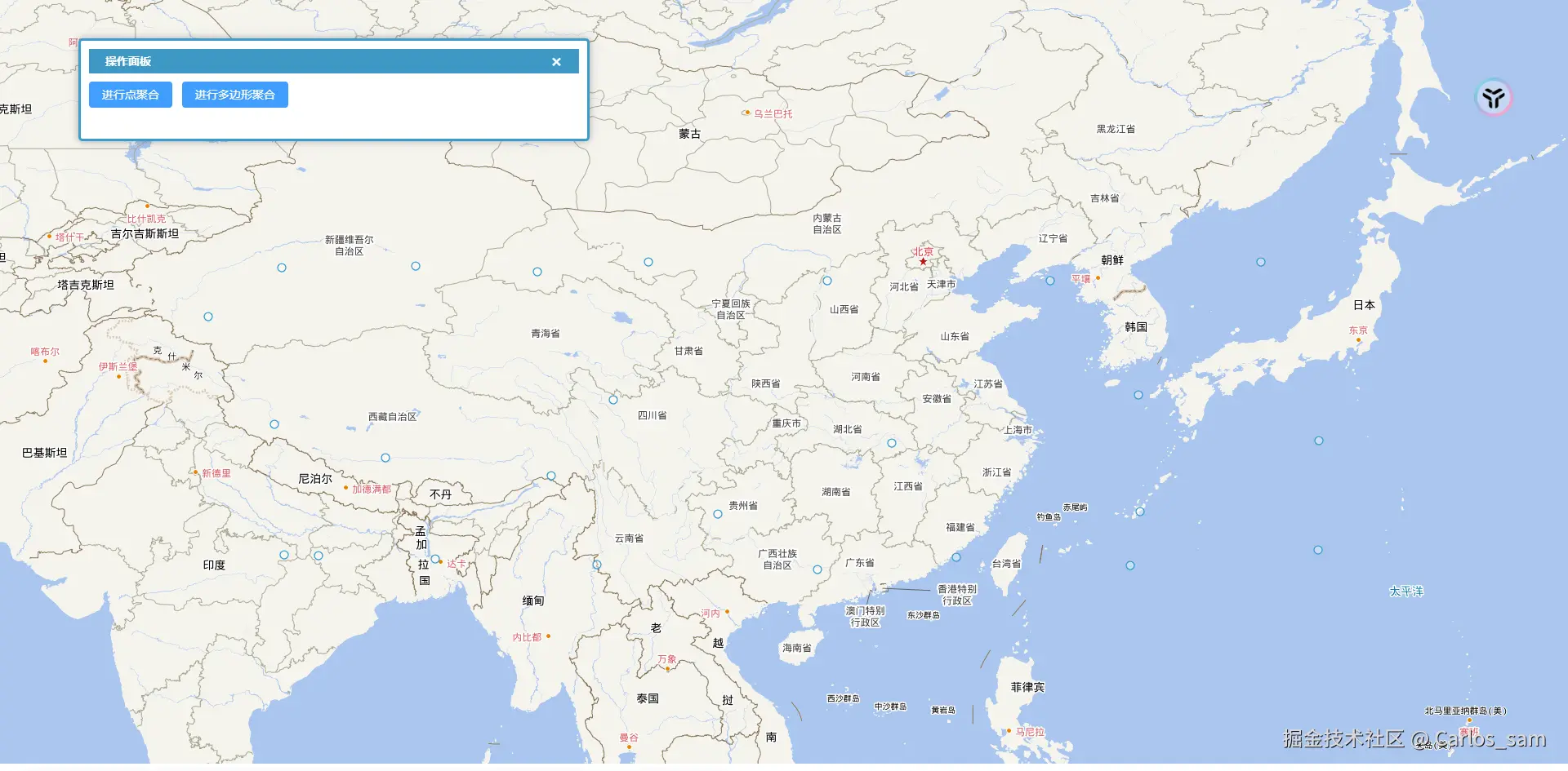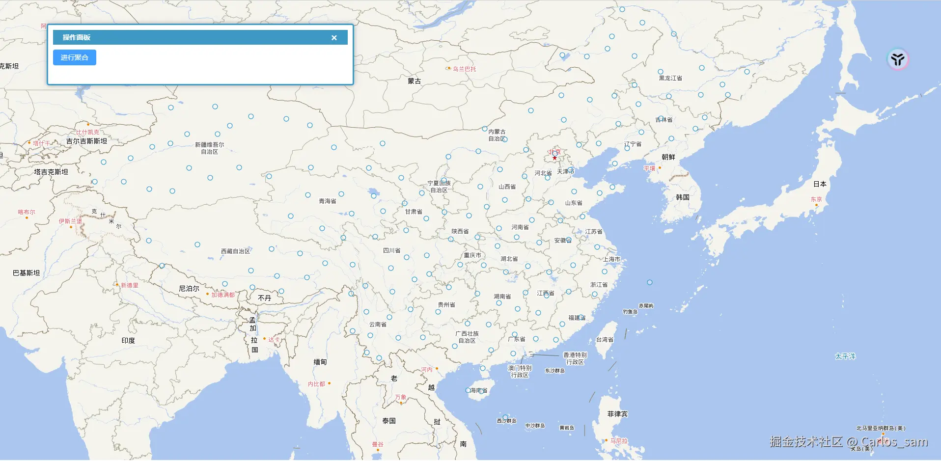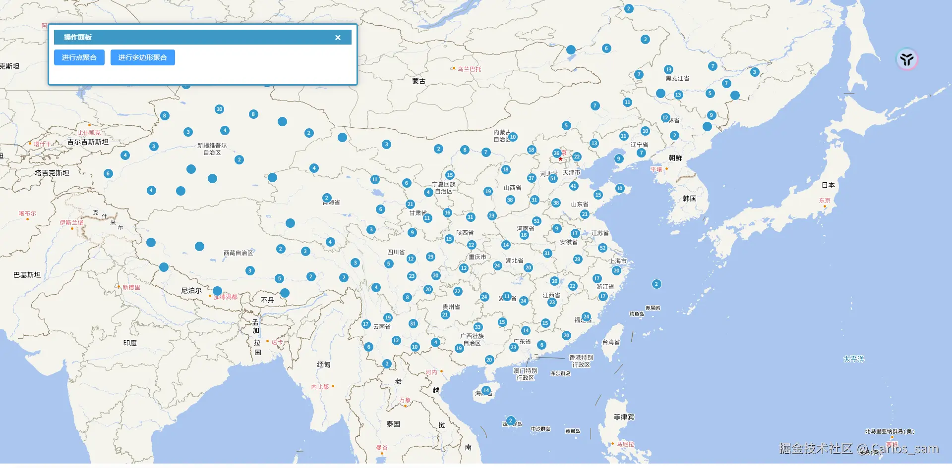如果是有一些点要素需要全部进行聚合,像这种情况实现起来就非常简单,只需要通过distance属性(以像素为单位)设置好聚合的范围就可以了。
